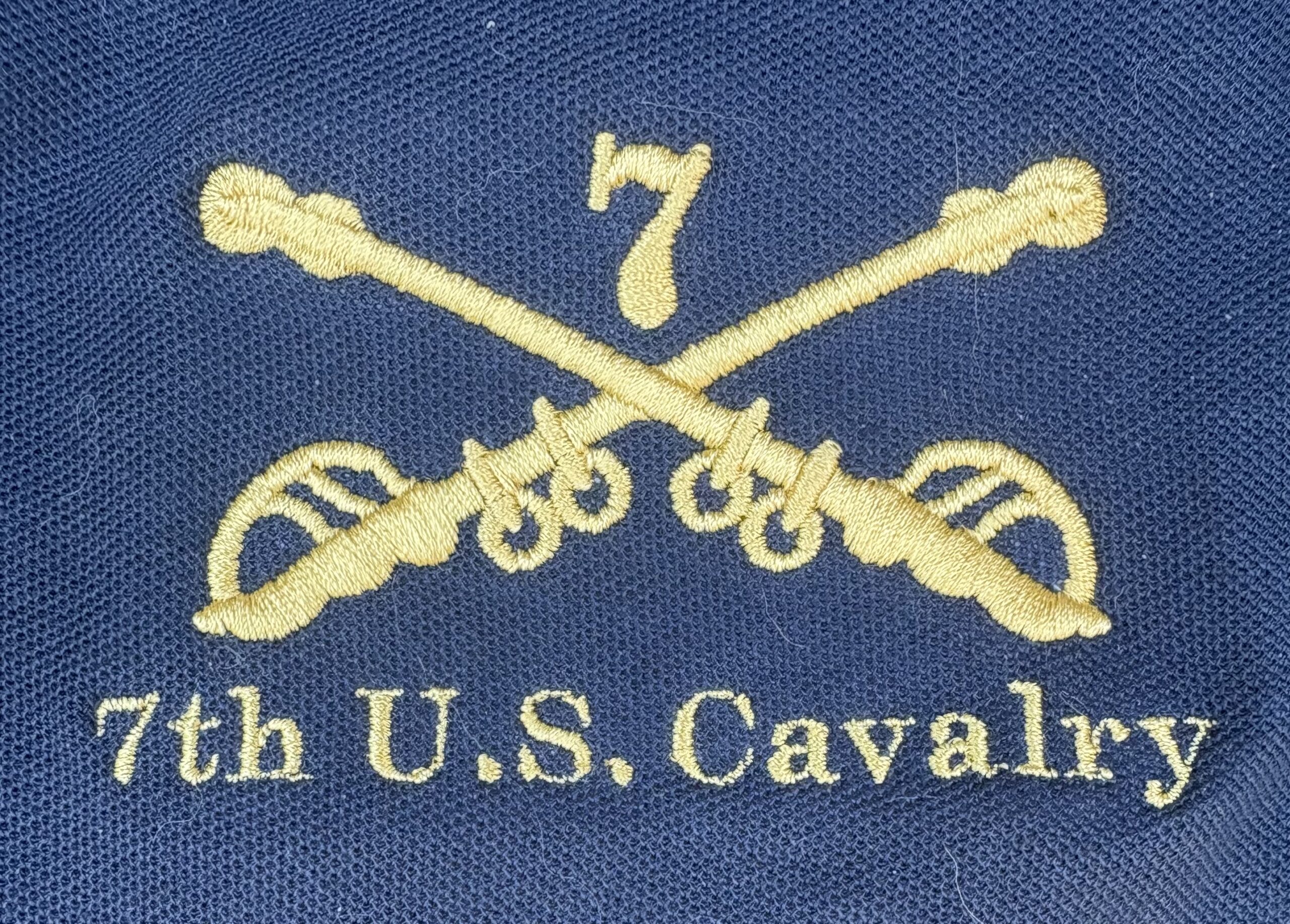 Honoring the famous unit that part with Custer at the battle of the little Bighorn. This fine t-shirt is great for reenactment, gaming, going out to dinner, and of course honoring someone in the family that served. High-quality embroidery on a blue t-shirt. All sizes available!