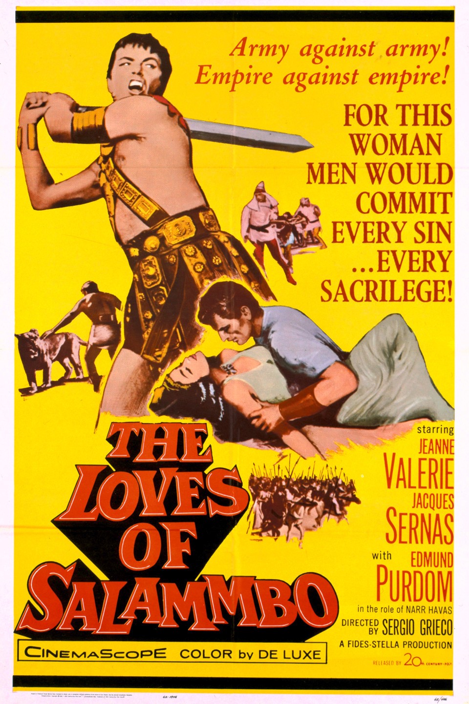 A “sword-and-sandal” film directed by Sergio Grieco, based loosely on Gustave Flaubert‘s novel, featuring Jeanne Valérie as the priestess Salammbô and Jacques Sernas as Matho, a barbarian leader, set during the Mercenary War in ancient Carthage, involving forbidden love, grand sets, and epic action. 1960